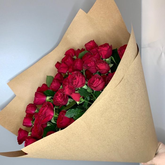 Роза кустовая – 15 шт.Лента атласная – 2 шт.Крафт – 2 шт.