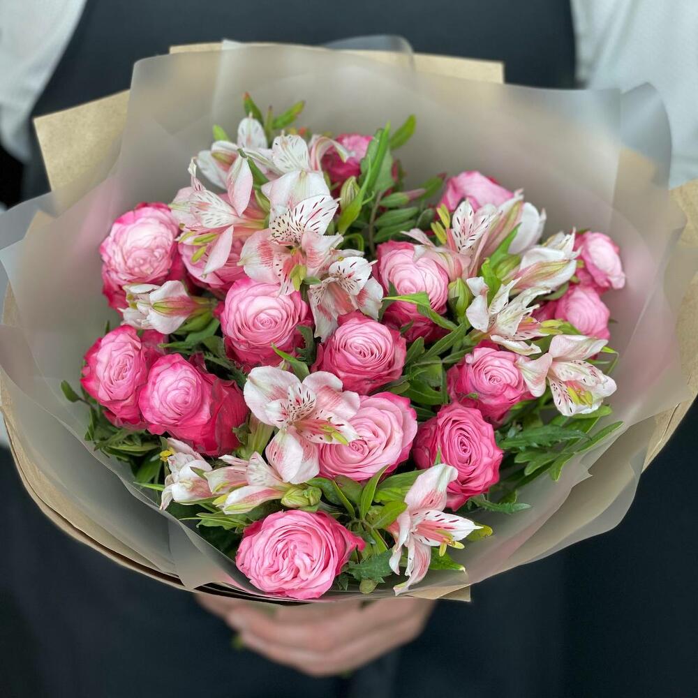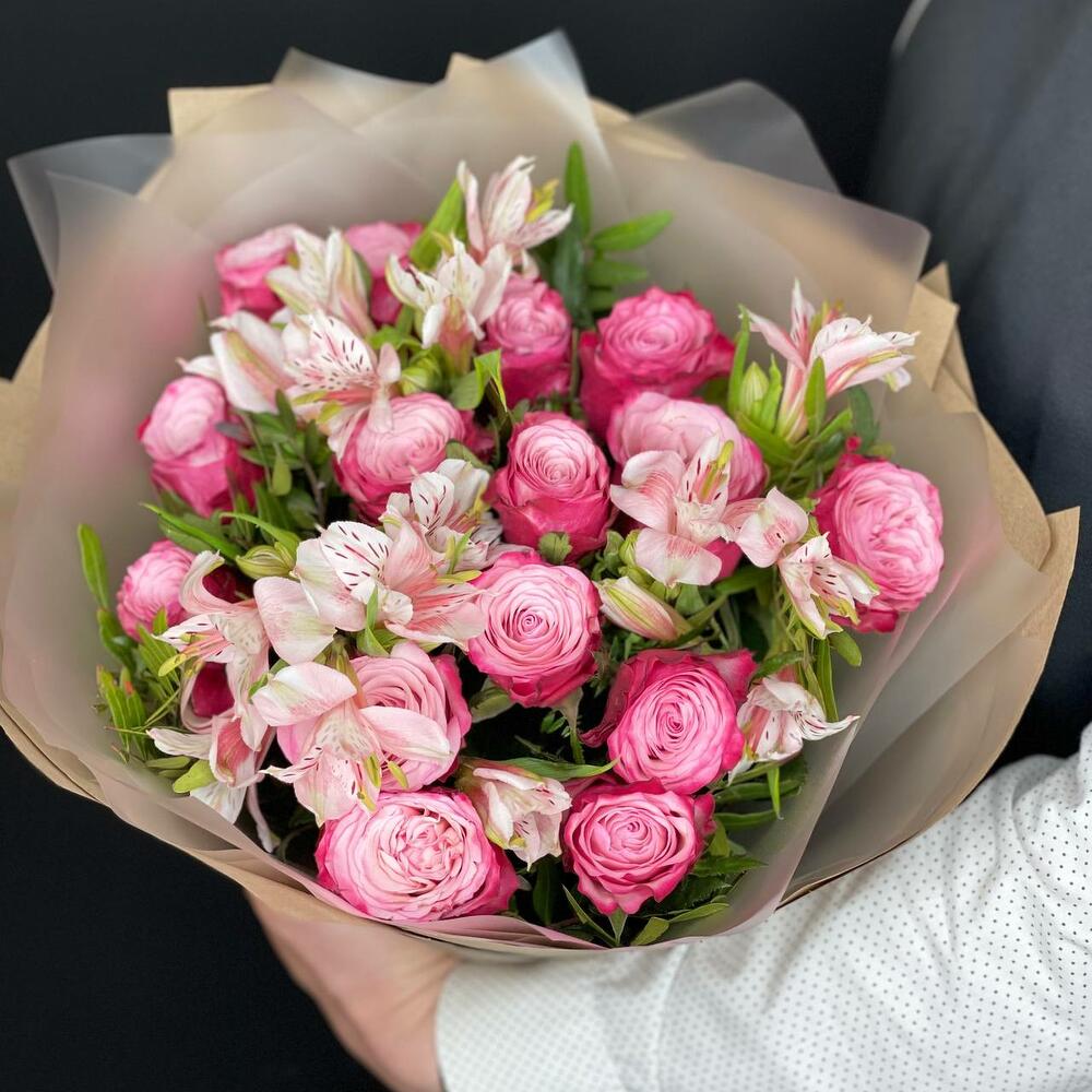 Роза – 15 шт.Альстромерия – 3 шт.Фисташка – 3 шт.Крафт – 3 шт.
