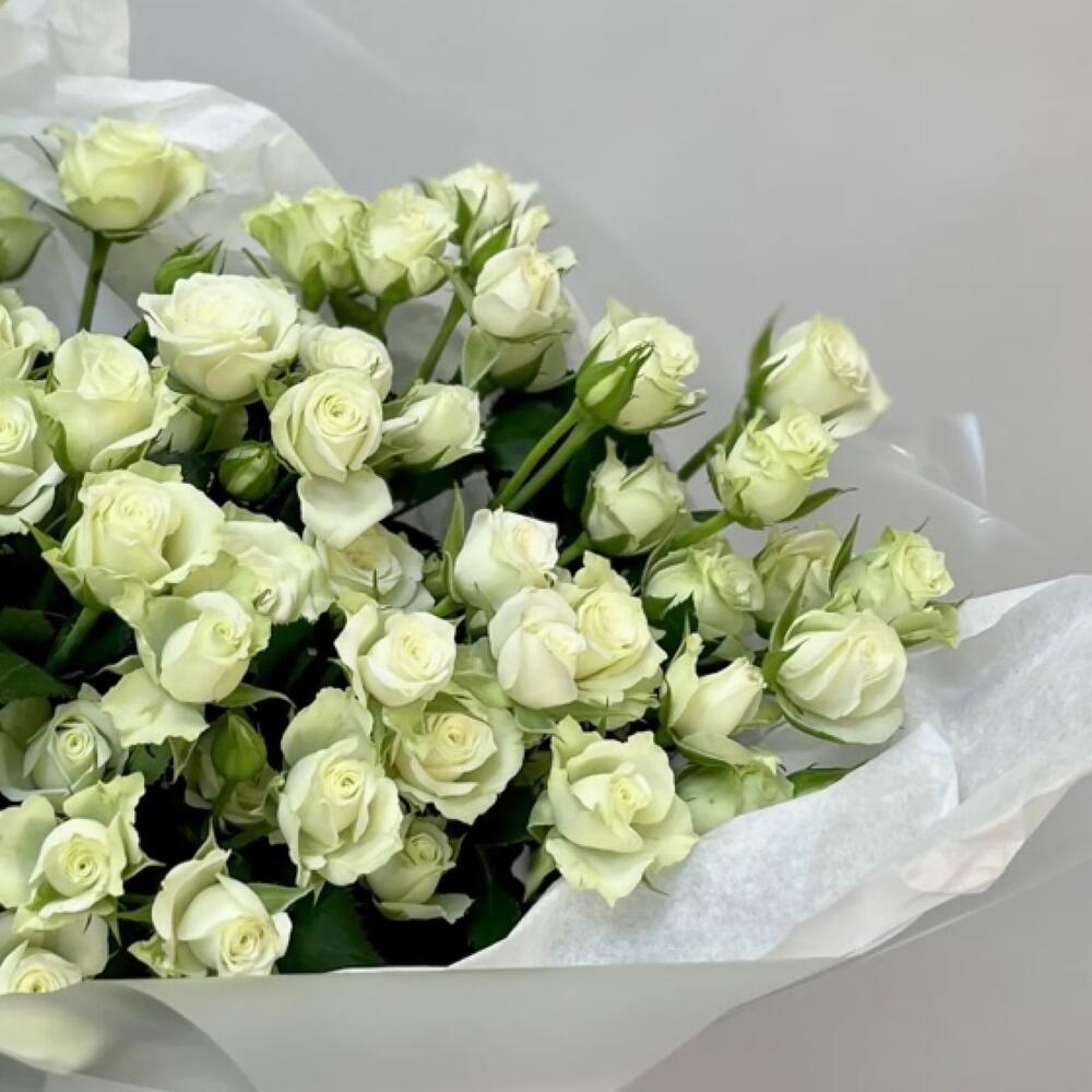 белые кустовые розы – 15 шт. Открыточка с вашими пожеланиями – 1 шт. Упаковка дизайнерская – 2 шт.