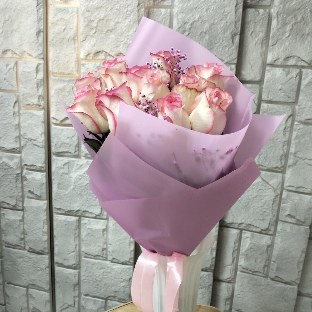Роза Эквадор – 11 шт.Лента атласная – 1 шт.Упаковка дизайнерская – 2 шт.Гипсофила розовая – 2 шт.