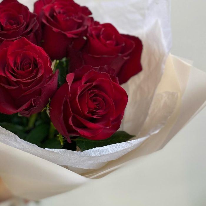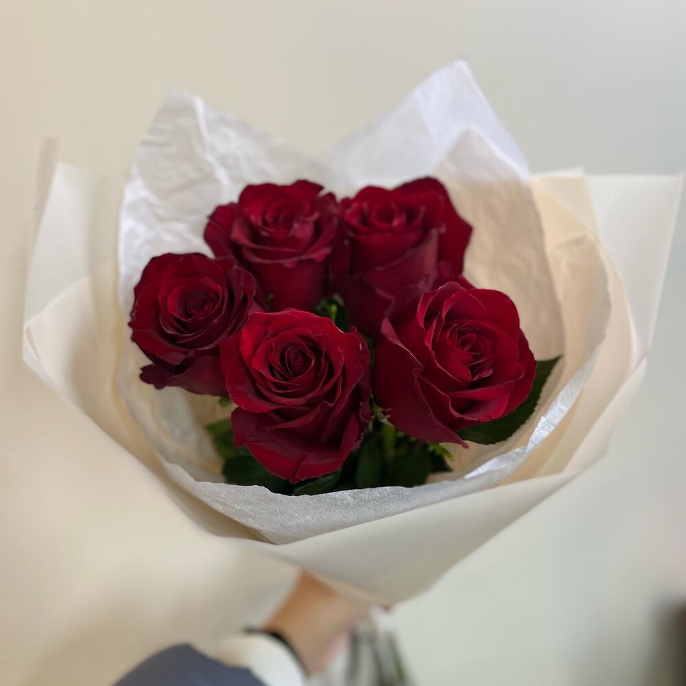 Упаковка с атласной лентой – 5 шт.Тишью белое – 2 шт.роза эквадор эксплорер премиум – 5 шт.