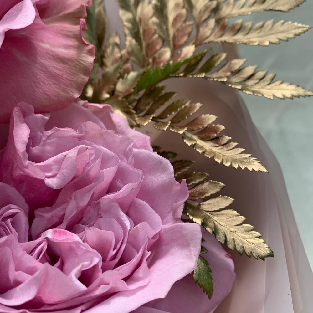Папоротник – 2 шт.Лента атласная – 1 шт.Упаковка дизайнерская – 2 шт.роза queens crown – 5 шт.