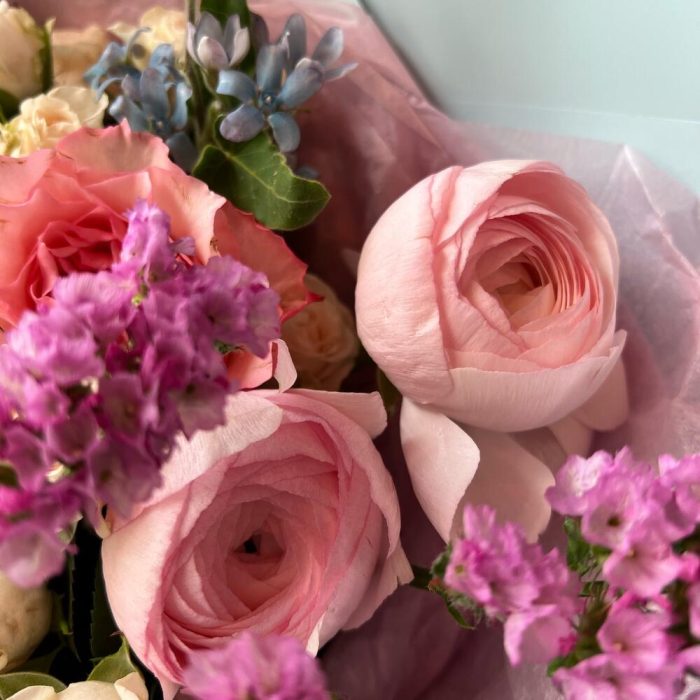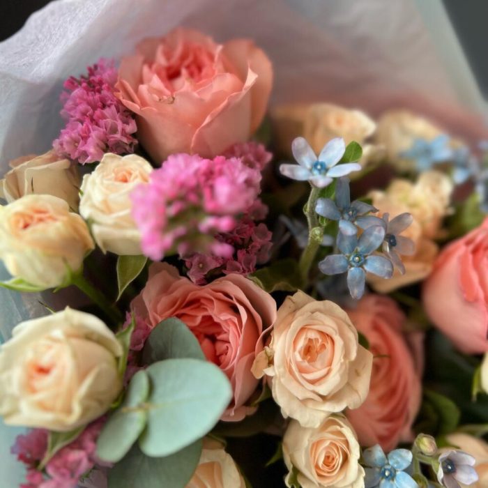 Кустовая роза – 4 шт.Ранункулюс – 3 шт.Пионовидная роза – 3 шт.Оксипеталум – 3 шт.Статица – 2 шт.Эвкалипт – 2 шт.декоративная упаковка – 1 шт.Атласная лента – 1 шт.