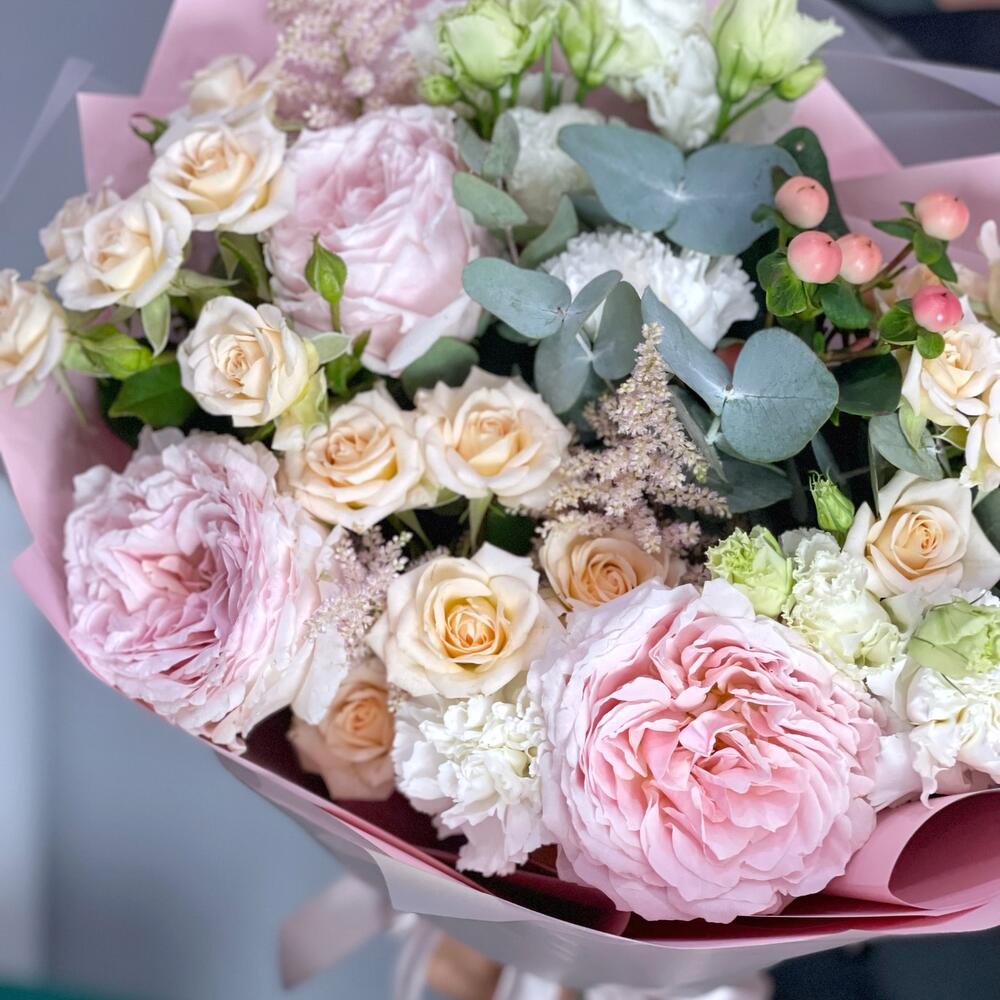 розы – 3 шт.Кустовая роза – 3 шт.Диантус – 2 шт.Лизиантус – 1 шт.Хиперикум – 1 шт.зелень декоративная – 1 шт.Упаковка дизайнерская – 1 шт.Хризантема Сантини – 1 шт.Маттиола – 2 шт.