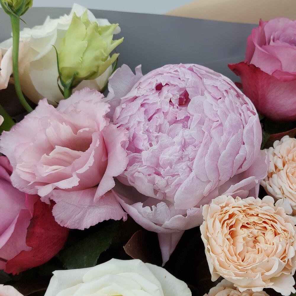 Пион – 2 шт.Роза кустовая – 3 шт.Эвкалипт – 3 шт.Роза Эквадор – 6 шт.Эустома – 3 шт.Упаковка дизайнерская – 1 шт.зелень стаффажная – 6 шт.гвоздика сортовая (диантус) – 1 шт.