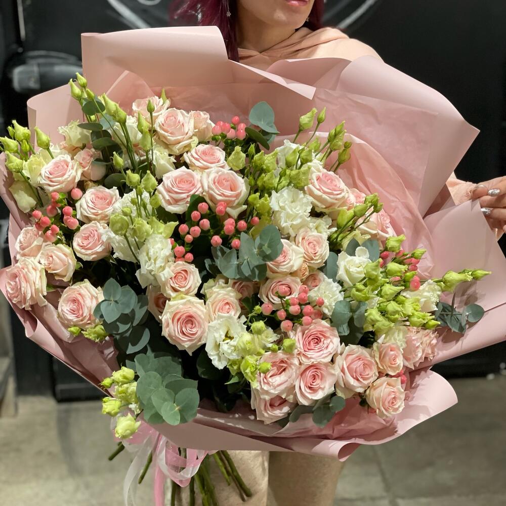 Гвоздики, Лизиантусы, Розы, Тюльпаны