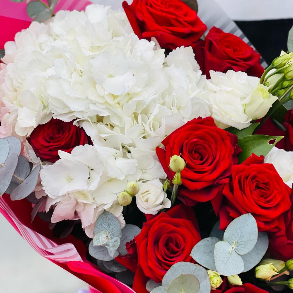 Гортензия – 1 шт.Роза красная – 9 шт.Рускус – 10 шт.Эвкалипт – 3 шт.Эустома – 5 шт.Лента атласная – 1 шт.Упаковка дизайнерская – 5 шт.