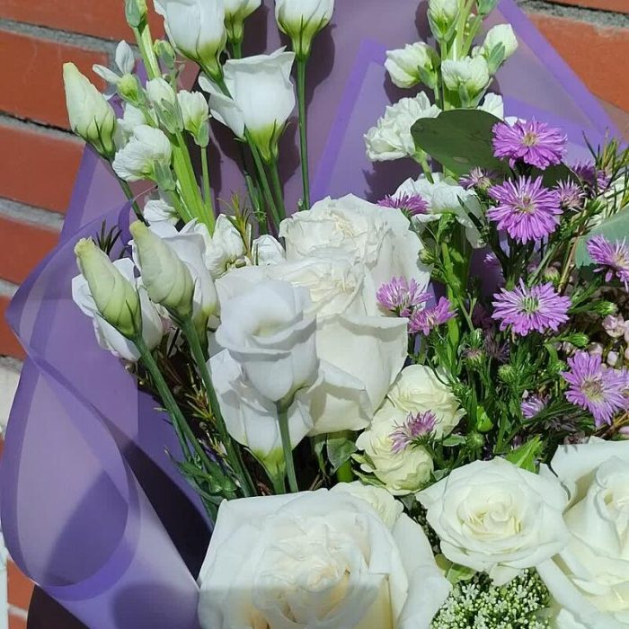 Сборный букет с розами, маттиолой, лизиантусом, эвкалиптом