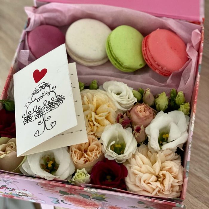 Кустовая роза – 1 шт.Зелень – 1 шт.Гвоздика – 1 шт.Оазис – 1 шт.Коробка – 1 шт.Макарон – 4 шт.Одноголовая роза – 5 шт.