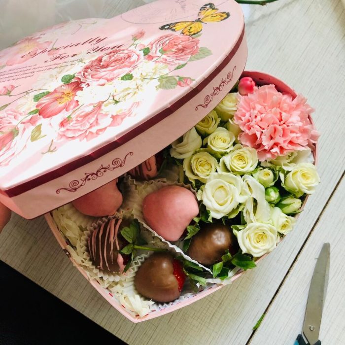 Роза кустовая – 3 шт.Диантус – 1 шт.Коробка – 1 шт.Клубника в шоколаде – 9 шт.