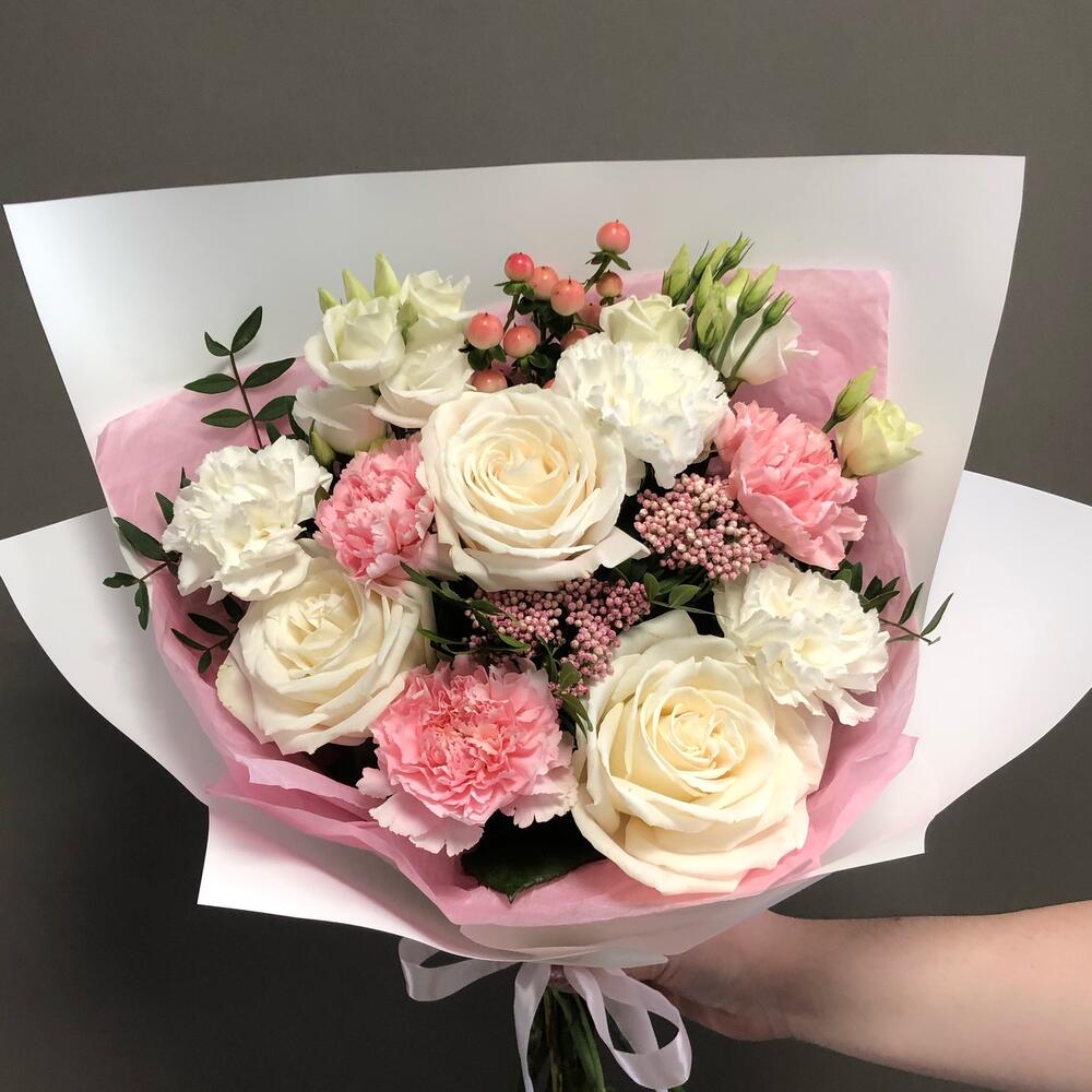 Гвоздики, Лизиантусы, Розы, Тюльпаны