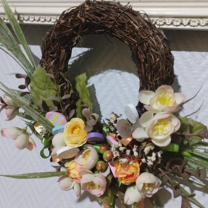 каркас из мелких березавых веточек – 1 шт.деревянные декоративные яйца – 5 шт.искусственые роза – 15 шт.Лента атласная – 2 шт.ветка зеленые искусственые – 2 шт.
