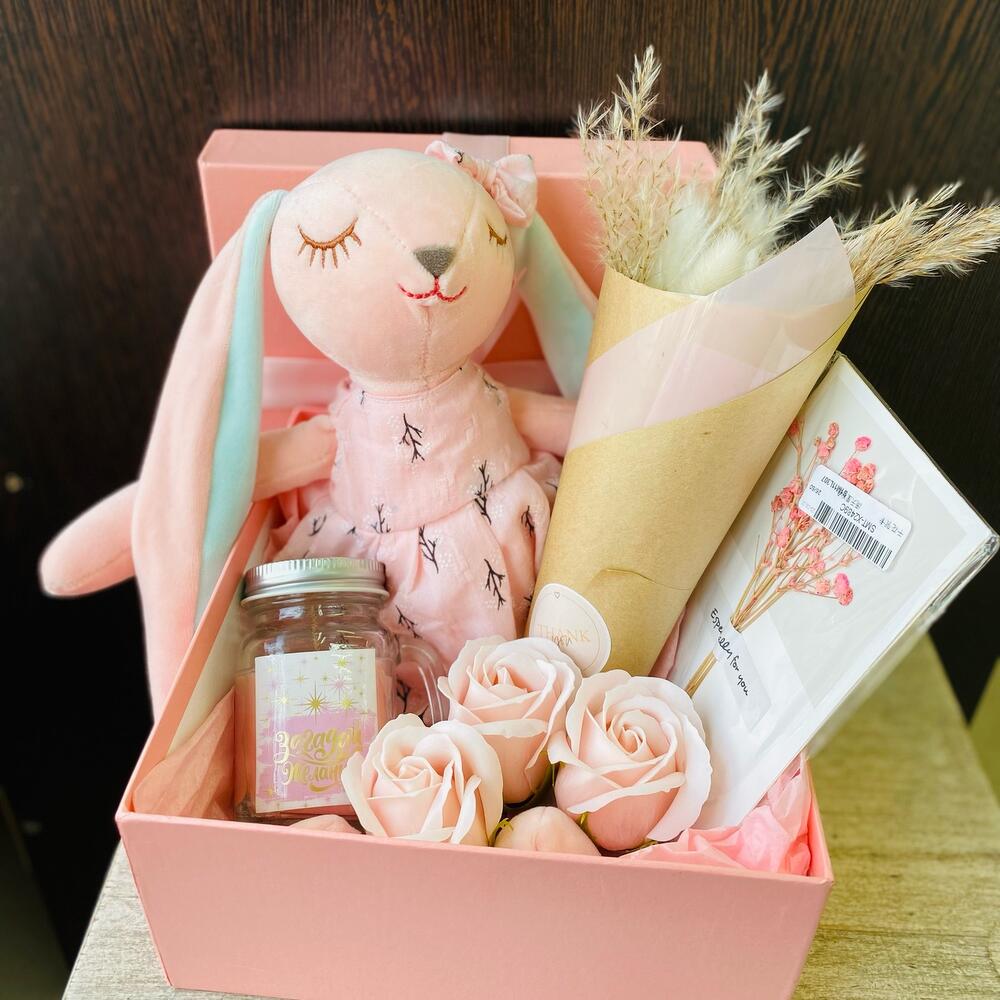 Коробка – 1 шт.Заяц плюшевый – 1 шт.открытка дизайнерская – 1 шт.свечи ароматические – 1 шт.букет из сухоцветов – 1 шт.роза мыльная – 3 шт.