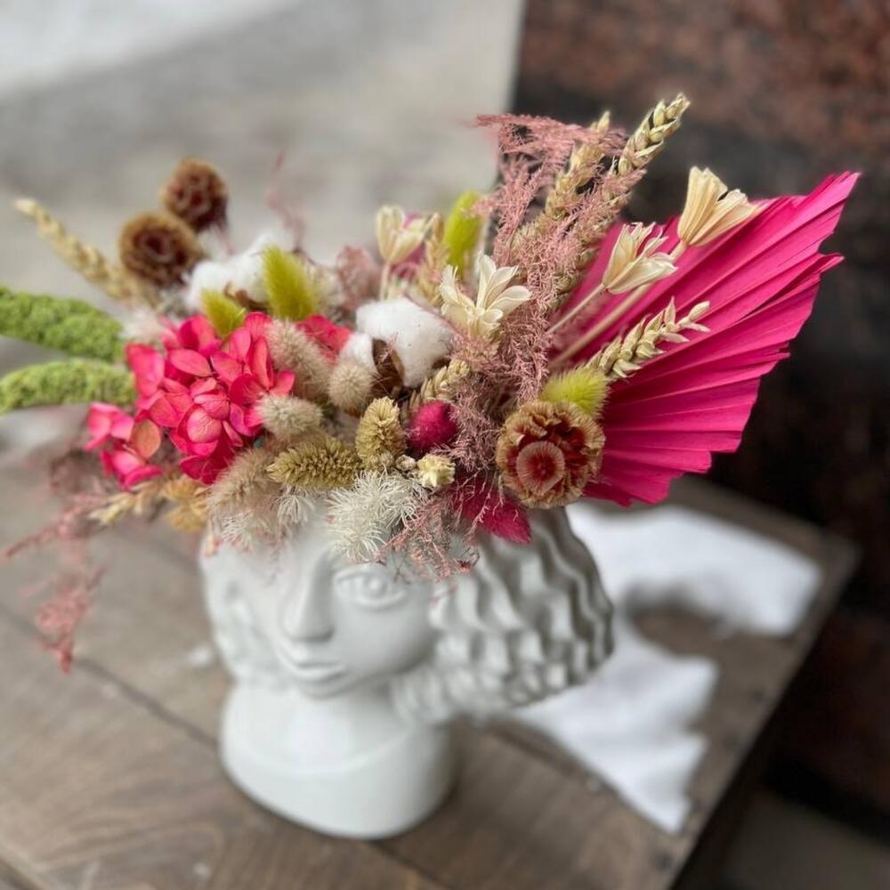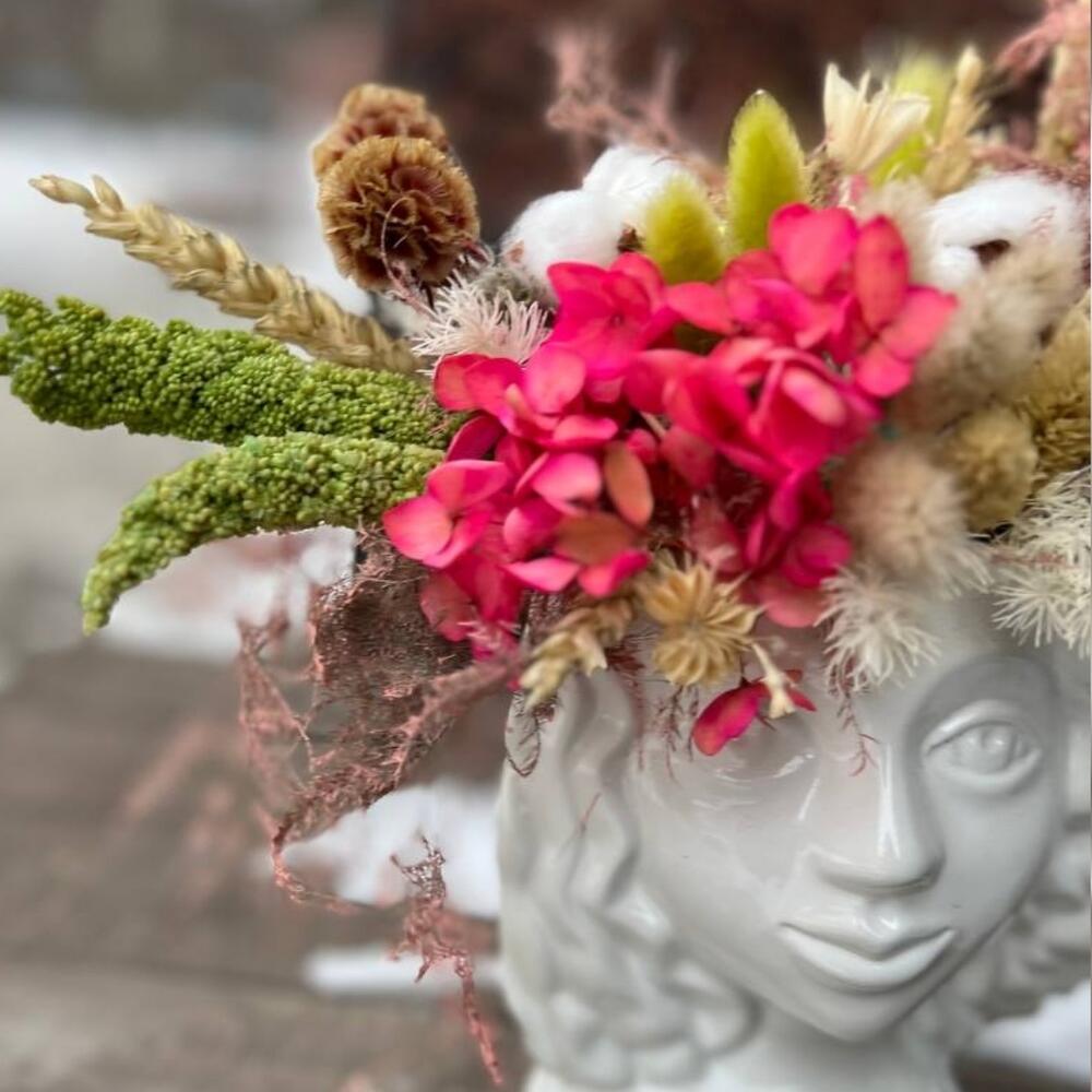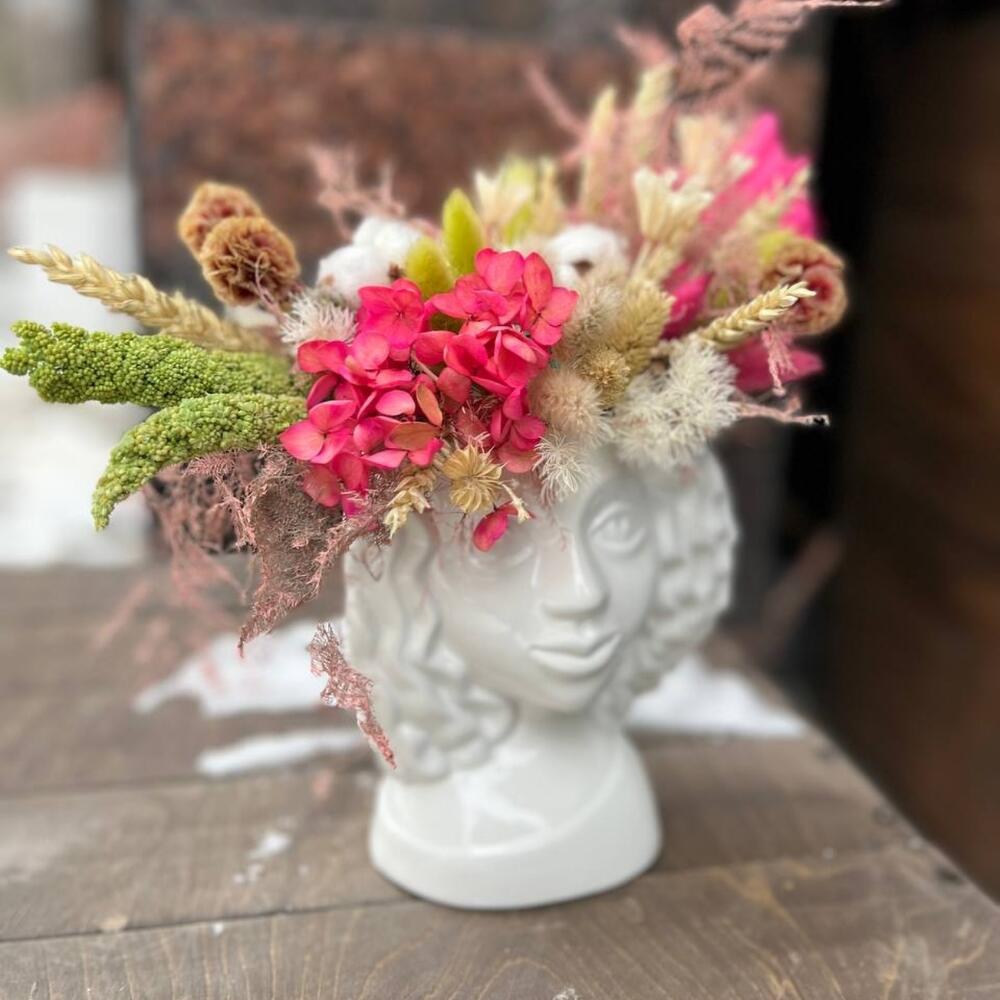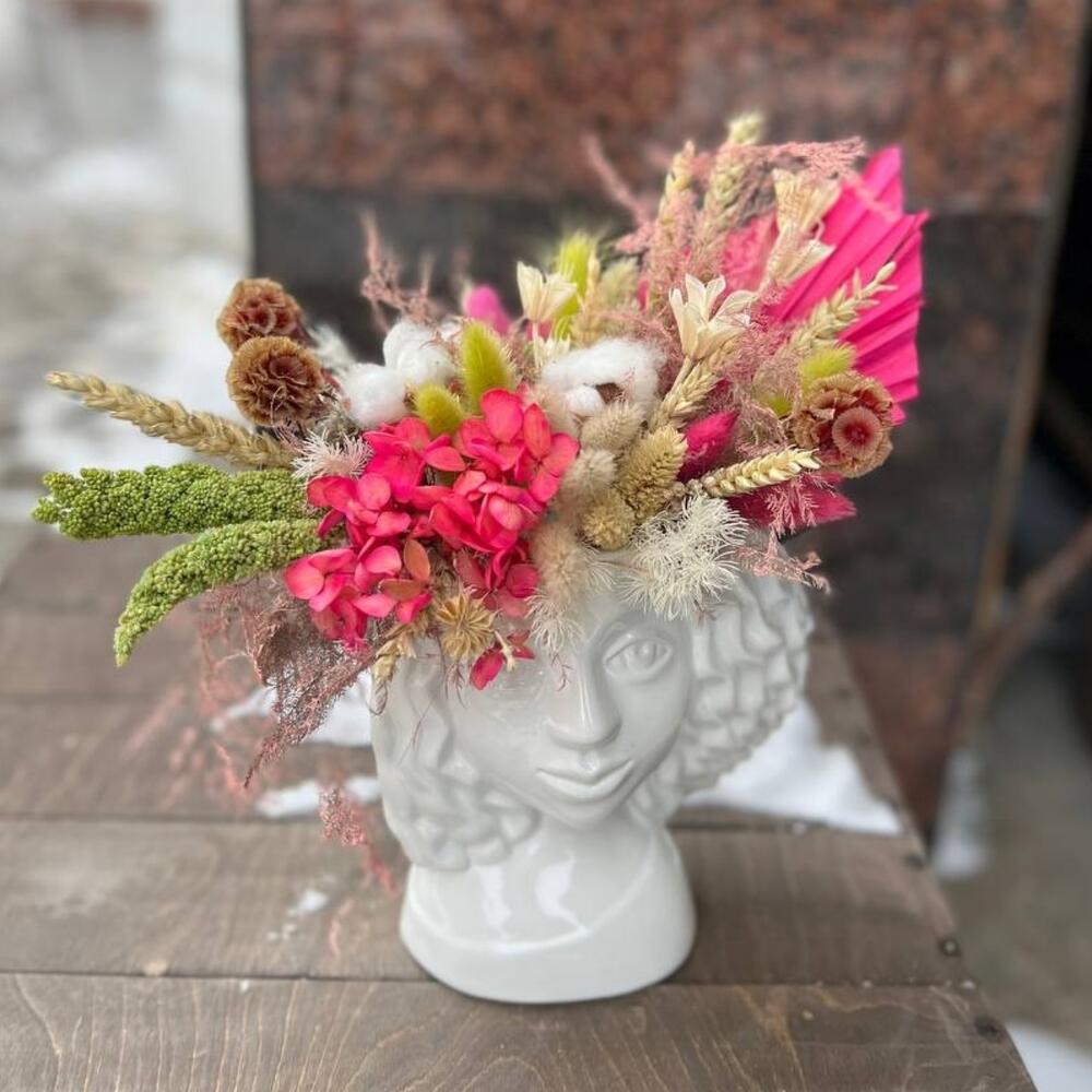 гортензия стабилизированная – 1 шт.Скабиоза – 5 шт.Хлопок – 3 шт.Лагурус (сухоцвет) – 15 шт.Пальма – 1 шт.аспарагус стабилизированный – 3 шт.Амарант – 3 шт.Нигелла – 3 шт.Колосья – 5 шт.Керамическое кашпо – 1 шт.