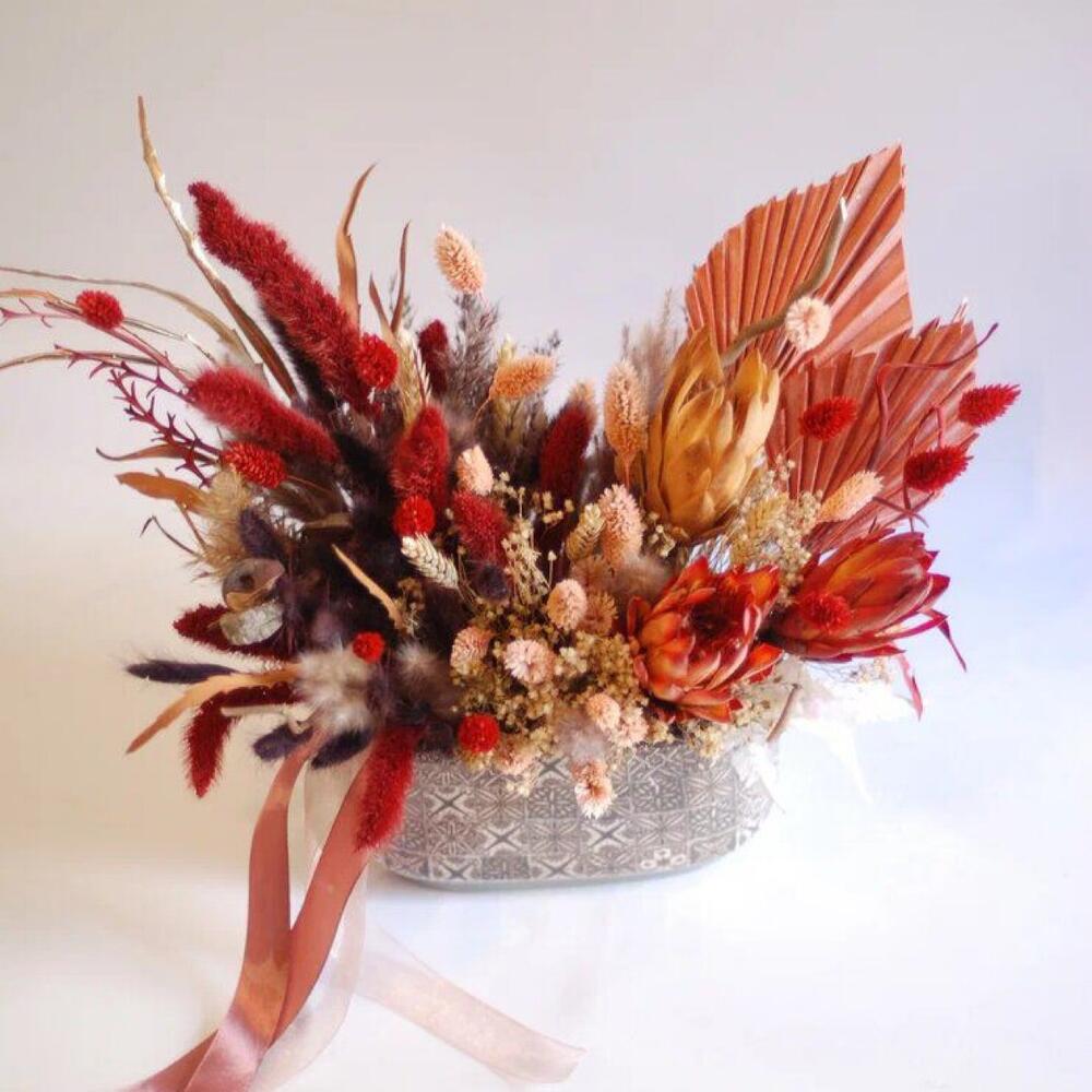 протечку сухоцвет – 3 шт.пальмовое копье – 2 шт.фаларис сухоцвет – 30 шт.Лагурус (сухоцвет) – 50 шт.гривелия – 2 шт.сухоцветы пучок – 15 шт.пшеница колосья – 15 шт.пушистики – 3 шт.ветки декоративные – 2 шт.Кашпо керамическое – 1 шт.