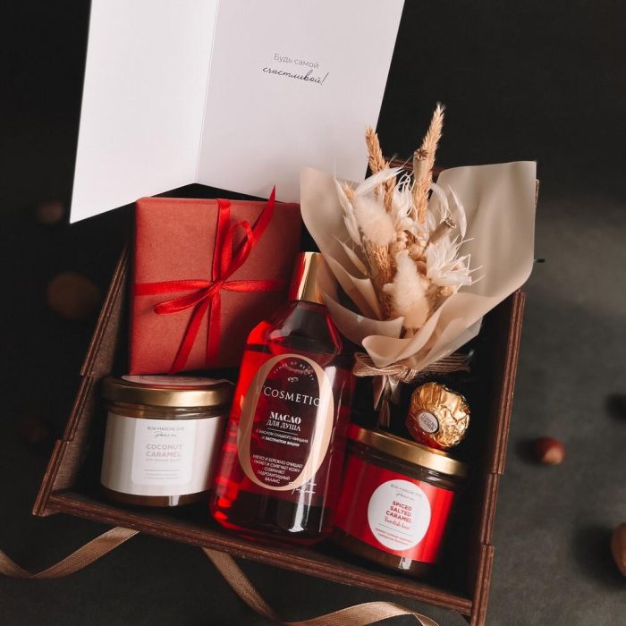 Шоколад ritter sport – 1 шт.масло для душа – 1 шт.кокосовая карамель – 1 шт.карамель шведская булочка – 1 шт.Сухоцвет – 1 шт.конфета ferrero rocher – 1 шт.