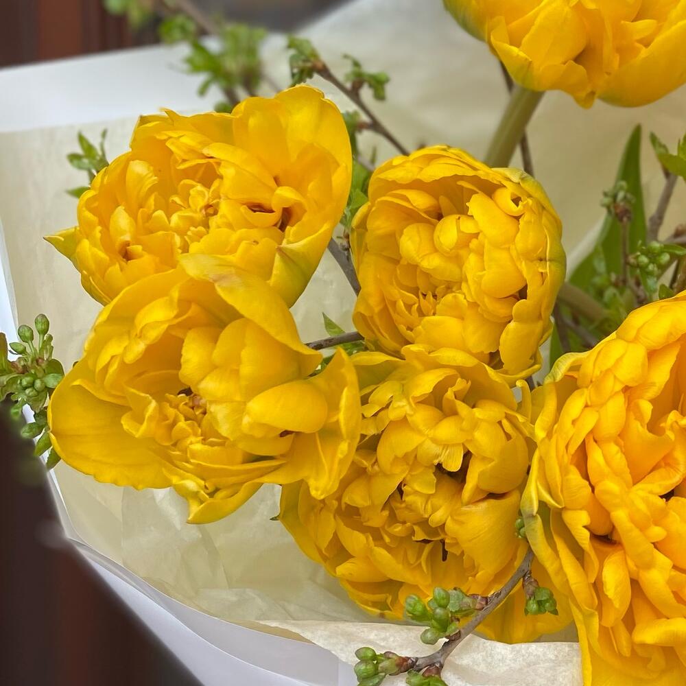 Тюльпан пионовидный – 9 шт.ветви цветущие – 9 шт.Упаковка дизайнерская – 5 шт.Лента органза – 1 шт.